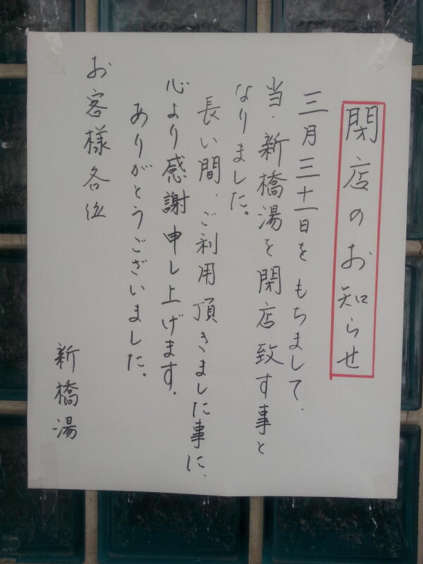新橋湯に、さよなら。恵比寿新橋湯は31日までですよー! pic.twitter.com/DpfXBdbJGu 2013-03-26 23:41:00