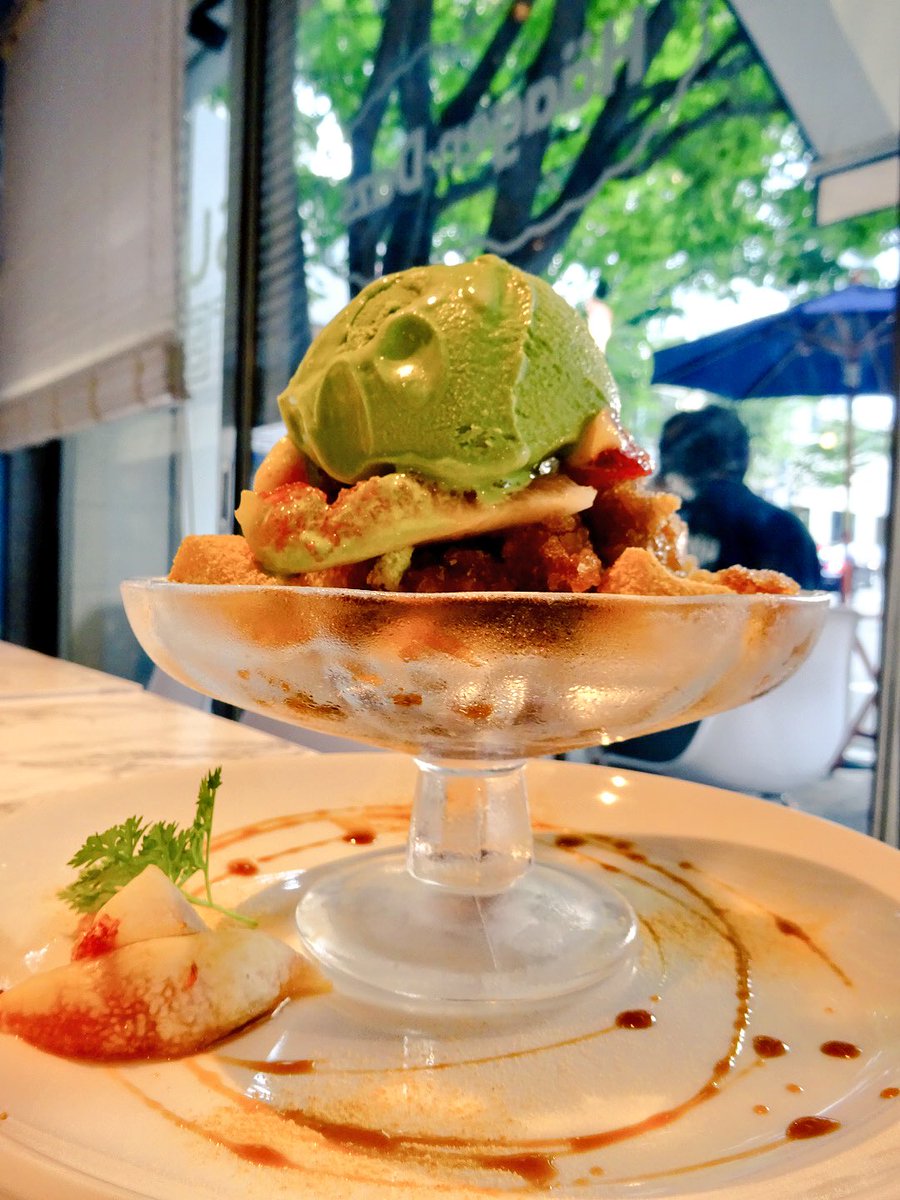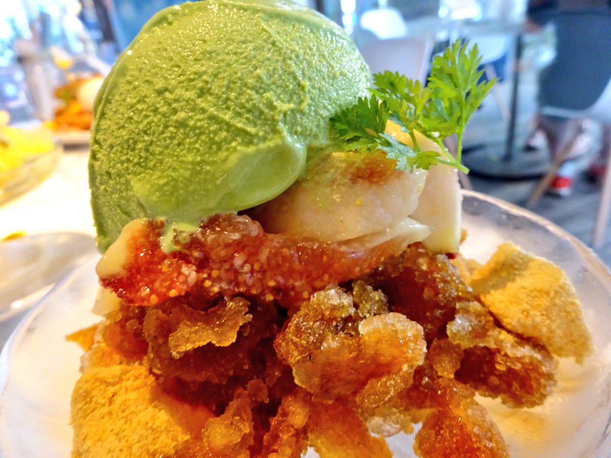 黒蜜グラニテに抹茶アイスとわらび餅とイチジク添え😄(950円)