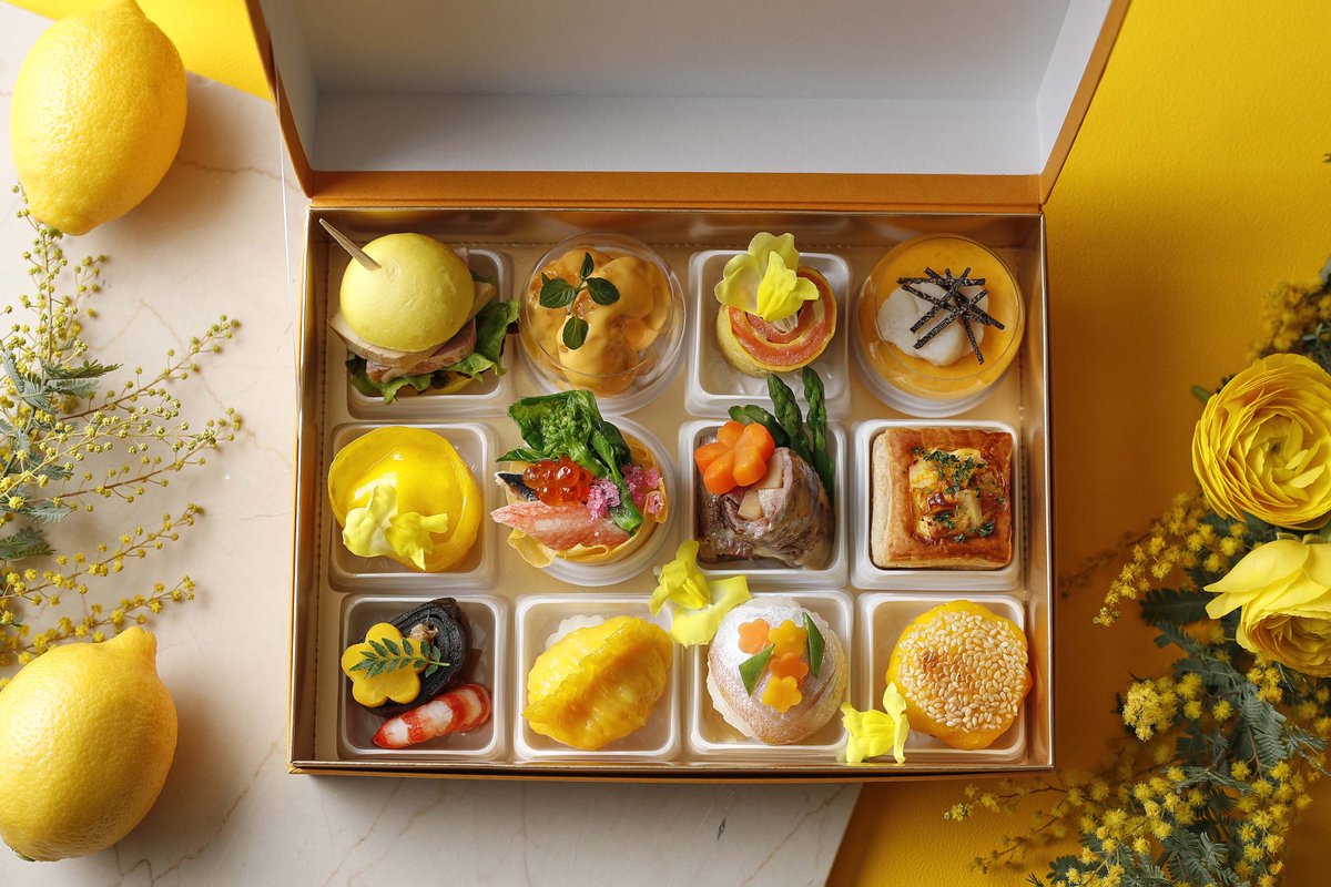 ”HAPPY YELLOW”をテーマに、今月だけのテイクアウトボックスをご用意しました。広東料理「龍天門」、日本料理「舞」、そして洋食キッチンから、フォアグラ、鮑、和牛フィレ肉などを使った人気のお料理を春らしいアレンジで贅沢に詰め合わせています。